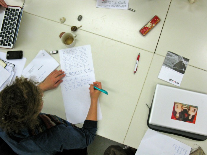 Mit der Hand Linien ziehen. Wobei!? – Die Druckbuchstaben von heute ähneln eher Buchstabenprozessionen, mächtigen Zeichenkolonnen. Ursprünglich geritzt, gekratzt für die Ewigkeit, für das vergessliche Gedächtnis, für die Verwaltung, die Enkel für – was eigentlich? Wer professionell schreibt, arbeitet für ein Publikum oder für eine Zielgruppe, wenn es besonders schlimm kommt. Wer schreibt, schreibt vielleicht auch für die, die nicht schreiben (können). Schreibend sich versichern ist fast so etwas wie ein Reflex, wie mir scheint. Schreibend vom Weg abkommen wahrscheinlich die edelste Aufgabe. Auf dem Limit schreiben, auf scharfem Grat. Deleuze sagt „d’en sortier“: rausgehen.