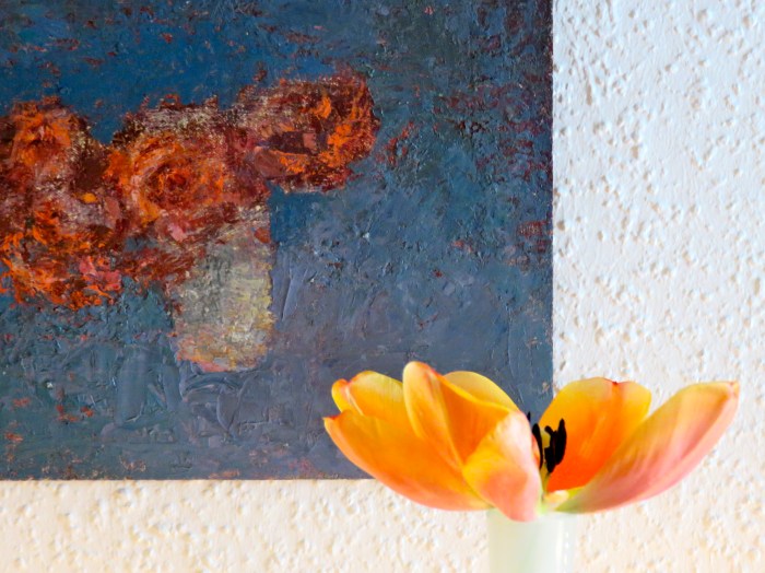 Ja, jetzt tanzen sie wieder, die Tulpen, wie Maren das so schön beschrieben hat. Ich weiß oft gar nicht, worüber ich mich mehr freuen soll: über die schönen Farben der Köpfchen, die Blütenblätterformen oder eben über die enormen Bewegungen, die sie in der Vase unternehmen. Wie Feuerwerk springen sie da gelegentlich in die Höhe. – Lebensweisheit!? In dem Alter bin ich also schon – !? 😉 Ja, solange man die eigenen Ziele nicht aus den Augen verliert, ist der Abschied vom Berühmtheitstraum kein Zurücknehmen von – hm, Schwung – sondern (vielleicht) eine Enttäuschung weniger…