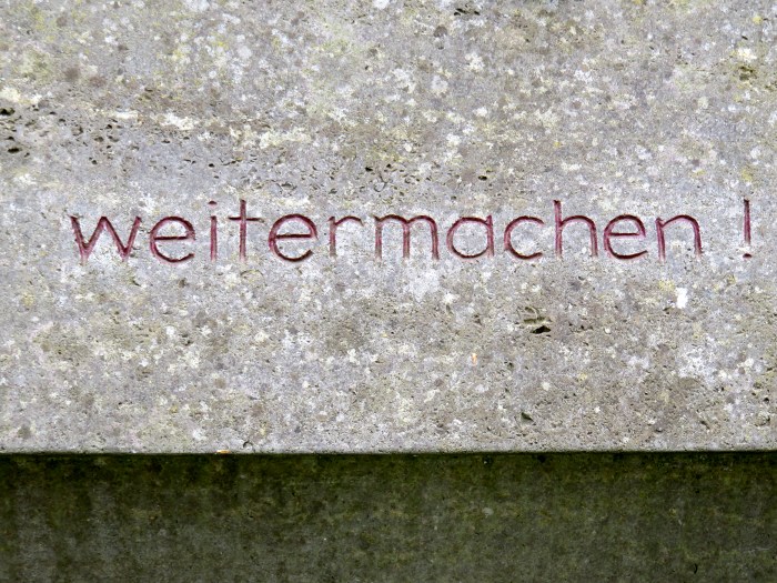 Ob man Grabsteine als kleinste oder persönlichste Denkmalform benennen darf, möchte ich nicht behaupten. Doch sind sie Steine von Denkanstößen für die, die über einen Friedhof gehen, um Freunde oder Verwandte zu besuchen, Berühmtheiten oder bloß das frische Grün der Bäume. Was denn auf den eigenen Stein kommen, ob es überhaupt einen solchen geben soll, sind vielleicht einige der Gedanken, wer diese Menschen wohl waren, die ihre Geburtsdaten, Namen, einen letzten Gruß oder ein Versprechen für die Lebenden hinterlassen, andere. Und dann plötzlich das: weitermachen! Selten habe ich mich von einem Toten so angesprochen gefühlt. Einem, dem es offensichtlich weniger ums Jenseits ging, denn um die Zukunft.