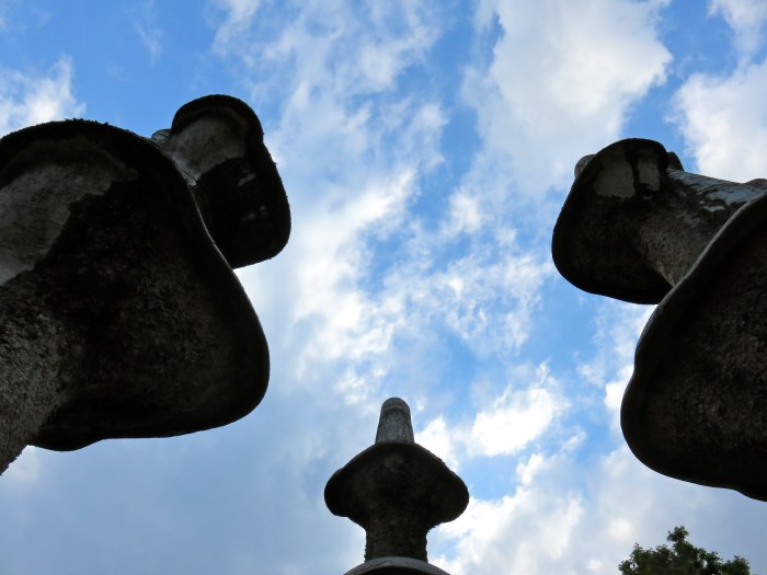 Was viele nicht bedacht haben: Ein Kunsteinkauf muss finanziert sein. Eine Skulptur ist zwar kein Hund, d.h. sie frisst nix, muss nicht zum Arzt und braucht kein Halsband. Aber sie kostet eben doch nach dem Erwerb weiter. Sie bröckelt oder wird mutwillig beschädigt, sie braucht ein Umfeld, auf dem sie sichtbar bleibt (also irgendeiner sollte schon den Rasen mähen), sie muss dokumentiert und regelmäßig begutachtet werden. Ähnliches gilt für Indoor-Kunst. Grafiken zum Beispiel gammeln in Höchstgeschwindigkeit, sobald sie Licht oder Feuchtigkeit ausgesetzt sind. Vernachlässigung tut auch der Kunst nicht gut. Gekauft wird natürlich weiter: was vorne fotogen glänzt, zerbröselt zwischen Hecken und in Hinterzimmern ohne Publikum. Nicht dass ich etwas gegen Ruinen hätte. Dieser Brunnen zum Beispiel wurde in den 1980er Jahren errichtet. Wasser läuft heute nur noch, wenn es regnet. Dabei geht es nicht mal um den Wert des Kunstwerks. Es sieht – wie viele seiner Kollegen – aus wie ein Denkmal für den Spruch „bestellt und nicht abgeholt“, wobei die Abholer das Publikum wäre, das beim Kauf wahrscheinlich nur als Statisten für die Einweihungsparty mitgedacht wurde. Wie Kunst für die Öffentlichkeit sein könnte – und was falsch läuft? Oder läuft es gar nicht mal so schlecht? Am Ende stehe ich wieder da mit Fragen. Mal sehen, ob sich Antworten melden.