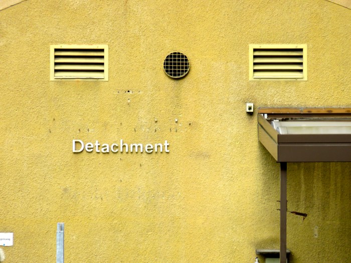 Soll es gelegentlich ja auch. Dann heißt es Stichwort, hockt mit ein paar Kollegen auf einem Zettel und wartet auf seinen Einsatz. Wer gedankenverloren durch den Sonntagnachmittag spaziert, mag mit dem Blick an unfreiwilligen Stichworten hängen bleiben. „Detachment“ kam mir heute unter, und ich gebe es wacker zu: Hätte meine Kamera keine Zoom-Funktion, ich wäre dran vorbei gelaufen. Aber so hatte ich ein Wort und schon flatterten Gedanken auf. Schwer zu beschreiben, so ein Gedankenstoß, denn da geht fast alles gleichzeitig, in halben Sätzen, viertel Fragen, vermischt mit Ähs und Ohs, aber dass ich zuerst dachte, „im Französischen hieße es ja détachement, also ist es Englisch“, erinnere ich mich. Dass das Wort auf dem Tempelhofer Flughafengebäude steht, gab die eine Richtung, die Erinnerung ans Vokabellernen aus der Schulzeit eine andere. Schließlich dass „trennen“ eben nicht nur „entzweien“, sondern, wenn man es sich auf Englisch vorsagt auch „freisetzen“ bedeutet, wurde ein besonders fröhlicher Gedanke, der noch viele Kapriolen schlug.