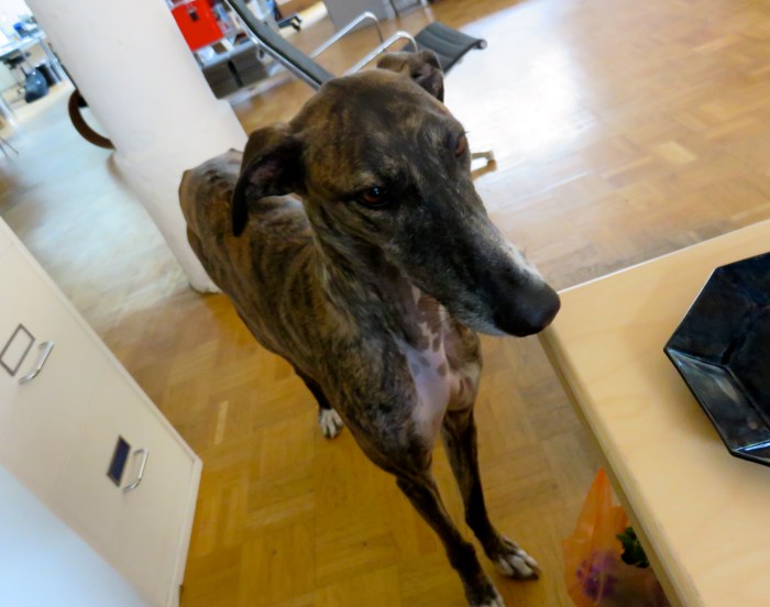 kommt aus Spanien. Rapido/Pido, auch liebevoll „Dickerchen“ genannt, ist für die Arena ausgebildet und lernt gerade die Büroarbeit lieben. Wahrscheinlich war er einfach zu verspielt, um Runde um Runde einem falschen Hasen hinterher zu laufen. Er wurde aussortiert und hatte Glück, dabei nicht gleich an den nächsten Baum gehängt zu werden oder sämtliche Knochen gebrochen bekommen zu haben. Er ist unglaublich zurückhaltend, geradezu höflich, was darauf schließen lässt, dass er mit gutem Benehmen eine Weile auf der Straße überlebt hat. Ob er von dort seine Vorliebe für Möhren (Veggi-Knochen) und Äpfel hat? Auf jeden Fall hatte er Glück, kam in ein Hundeheim und von dort zu seinem neuen Rudel, meiner Kollegin und ihrem Freund. Wenn er sich auf den Boden legt sieht er aus wie ein gefällter Baumstamm, so lang ist er (im Körbchen rollt er sich natürlich nach Hundemanier zusammen). Und er passt mit seiner Nase genau auf meine Schreibtischplatte. Wo er gelegentlich die Lage peilt. Dann schnuppert er ausdrücklich an der Möhre oder dem Apfel. Mehr nicht. Selbst wenn ich in die Küche gehe, liegen Obst und Gemüse noch da. Aber Pido hat sie meist immer noch aufmerksam im Blick. Ich freu‘ mich, dass ich mich auf ihn verlassen kann. Nur weiß ich beim besten Willen nicht, wie man so einen großen, dünnen Hund fotografiert!