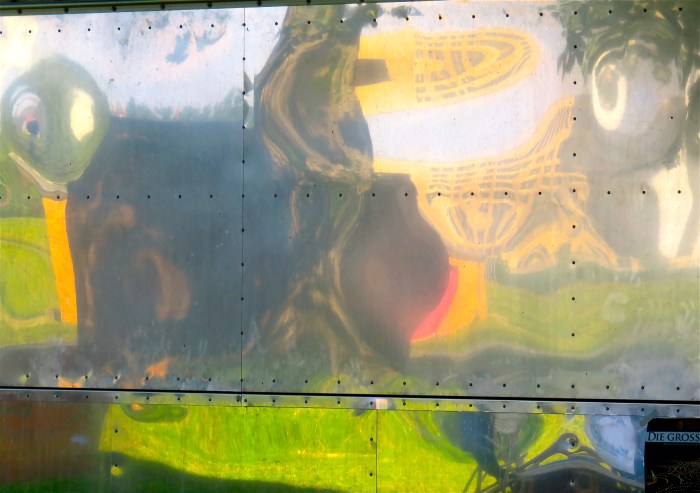 Juli = Wenn es heiß wird und die Kanten schmelzen. Rechts verläuft der Tempelhofer Ex-Flughafen, oder besser: er verpuzzelt sich in Hundertwassermanier verpuzzelt und hängt – architekturuntypisch – auch noch in der Luft. Daneben ein pulsierender Baum, Lichtstrudel, ein Aliengesicht ohne Körper, viele unbekannte Objekte. Und das alles morgens um zehn, ohne irgendwas im Tee (oder im Kaffee) zu haben. Kurz denke ich, ob es so ist, wenn Alzheimer die Sicht verunklärt – ? Wo man noch Dinge erkennt, aber nicht mehr ihren Bezug zueinander, auch nicht der Ort, den sie bezeichnen. Ich denke auch daran, dass die Bilder, die entstehen, sobald ich die Augen schließe, ähnlich sind. Wie Lichtschlieren. Allerdings stets abstrakt. Um sich dann schnell in nicht geträumte Bilder oder Träume im Wachsein (keine Tagträume) zu verwandeln. Realität = Ein Leben ohne festen Boden, bei dem man auf solche Bilder gefasst sein sollte. Und wenn die Kunst es schafft, uns daran zu erinnern?