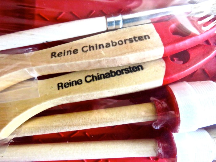 Da war ich doch einen Moment platt: „reine Chinaborsten“ – ? Klar, irgendwas muss vorne ja am Pinsel dran sein, aber was sind Chinaborsten? Chinaböller kenne ich. Aber Borsten wachsen nur am Vieh. Also Chinaviehborsten? Und warum rein? Weil noch keine Farbe dran klebt. Ja, was denn? Der freundliche Fachverkäufer? Dann doch lieber Google. Und klar: Schweine. Je älter das Tier, desto länger die Borsten. Und rar werden sie. Weil die Schweinchen jung besser schmecken. Meine reinen Chinaborsten sind eher kurz. Und mittlerweile rot. Nö. Kein Blut. Rote Kringel in der Küche. Weil bald schon wieder Herbst kommt. Und dann der Winter. Da brauche ich Farbe.