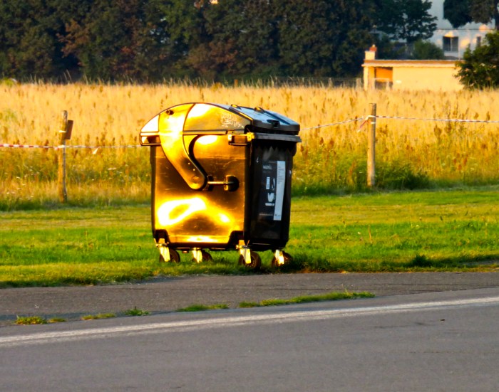 Was so eine Sommersonne alles kann. Kurz mal die schnöden Dinge des Alltags – wer bitte schön lässt seine Blicke länger als nötig auf einer Plastikmülltonne ruhen? – mit Gold überziehen. Jaja, und plötzlich ist man doch sehr froh, dass die Tonnen hier und da stehen. Schön sieht sie aus, elegant mit ihren Kurven und Dellen, und in Wahrheit strahlte sie, als wenn sie in Brand stehen würde (aber da würde sie auch nur rußig kokeln und rauchen, kennen wir alles). Auch sonst setzt so eine untergehende Sommersonne so einiges in leuchtenden Farbenbrand. Wo immer glatte und spiegelnde Oberflächen sind, zack! goldenes Gleißen, aber nur für wenige Minuten. Sonnenuntergänge gehen auch in Berlin noch zügig. Tja. Was soll man da sagen? Ein Hoch auf den Sommer! Mindestens. Auch oder gerade weil im Rücken schon ein Gewitter im Anzug ist.