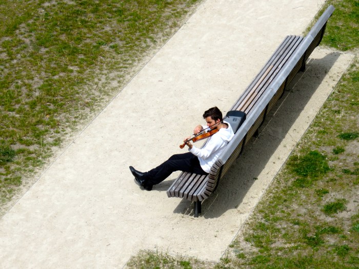 Nein, ich weiß nicht, wie der junge Mann lebt. Dass er Geige spielt, scheint mir ein gutes Zeichen. Er sah ganz entspannt aus, nicht so, als wenn ihm das Spiel unbehaglich wäre. Ein gutes Leben? Ich denke in den letzten Tagen wieder viel darüber nach, was ein gutes Leben ausmacht. Vor allem frage ich mich, wie ich eigene Unzulänglichkeiten akzeptieren kann, ohne sie zu pflegen. Entspannt zu sein ohne selbstgefällig zu werden, wäre eine andere Formulierung. So denke ich oft, ich muss es nehmen, wie es ist – oder kommt, dann denke ich wieder, es wäre besser, Dinge zu ändern oder Ziele zu setzen. Unvollkommenheiten auch in meinem (Arbeits-)Leben annehmen, oder an Verbesserung arbeiten? Die eigene Art zu Leben feiern oder eine andere Frau werden oder es zumindest zu wünschen? Über mich hinauswachsen? Oder das nutzen und pflegen, was in mir ist? Eigentlich ahne ich, was (für mich) stimmt. Dennoch überkommt mich manchmal Panik, ich könnte am Ende meines Lebens feststellen, alles verpennt zu haben. „Selbst auf dem höchsten Thron der Welt sitzen wir nur auf unserem Arsch“, schreibt Montaigne. Ja. Aber mir ist noch nicht klar, ob es doch einen Unterschied macht, wo man auf seinem Arsch sitzt, im stillen Kämmerlein, unter Freunden, unter freiem Himmel? Gelassen suchen? Sich umgucken? Ab und zu den Arsch hochheben? – So vielleicht…