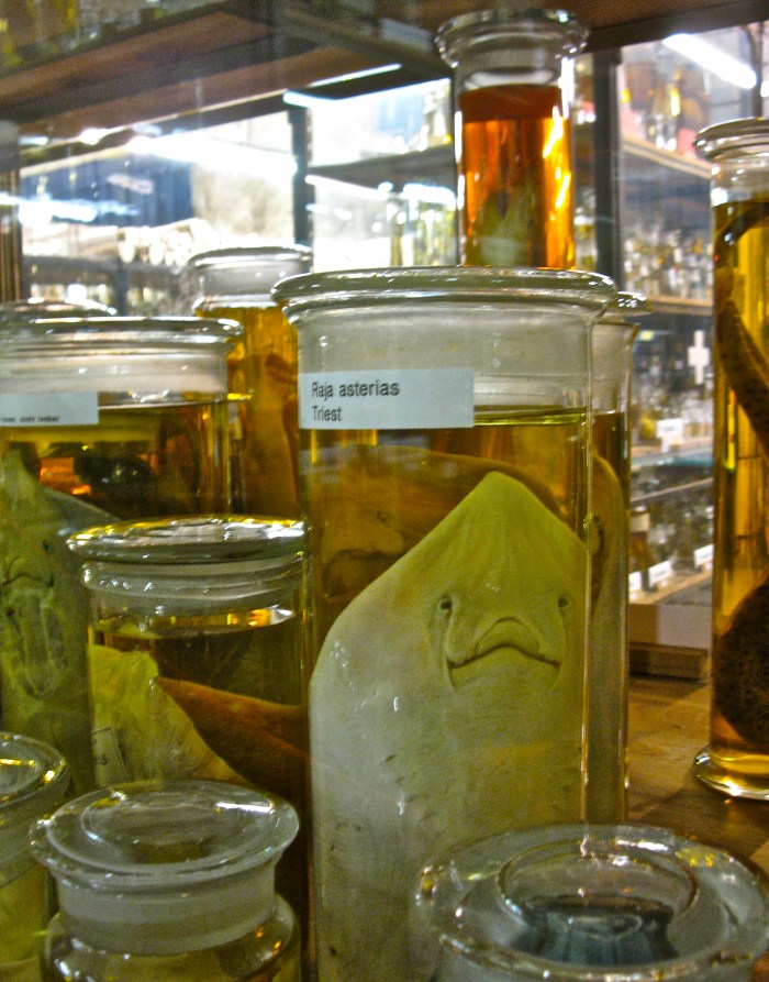 Dass sie in Alkohol schwimmen, mag sie kaum trösten. Sie sind nämlich schon längst mausetot und wer sich mit Geistern und Gespenstern auskennt, weiss, dass sie weder riechen noch schmecken können. Aber schön anzusehen sind sie schon, die eingelegten Fische aus der Sammlung des Berliner Naturkundemuseums (hier noch in ihrer alten Abteilung). Ich hätte mir zu gerne welche stibitzt, um eine ordentliche Mitternachtsparty zu Hause hinzulegen, aber natürlich sind die Fischlein in ihren Gläsern viel zu schwer. Aber wer jetzt denkt, hart erkämpfte Funde aus verschiedenen Forscherleben vor Augen zu haben, wird enttäuscht. Denn die meisten Exponate werden von den Wissenschaftlern schlicht und schnöde auf Fischmärkten gekauft. Na gut, da müssen sie vielleicht auch wochenlang auf der Lauer liegen und sehr früh morgens aufstehen, um die besten Fänge dem Spitzenkoch vom Platz streitig zu machen. Warum die im Museum überhaupt Leichen aufbewahren? Wegen des Artensterbens. Kann ja sein, dass Raja asterias längst nicht mehr durchs Mittelmeer düst. Der hier sowieso nicht. Aber wer weiß. Ich habe die Gesellen ja doch in Verdacht, nachts ein Eigenleben zu führen. Wie ein Flaschengeist, der den Zauberspruch kennt, sich selbst aus seinem Glas zu befreien.