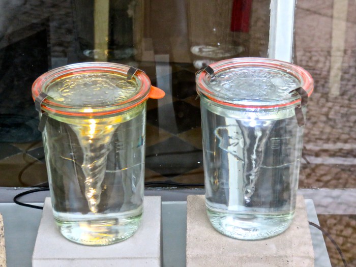 Das war vorgestern ein Hallo! Auf dem Weg zum Hermannplatz kam ich an einem Schaufenster vorbei, in dem zwei kleine Wasserstrudel in Weckgläsern strudelten. Ich konnte es nicht fassen! Waren solche kleinen Wasserstrudel doch eine Lieblingsfantasie meiner Kindheit. Ich stellte mir vor, wie aufsehenerregend solche Objekte im Regal wären. Und welche Freude, dem Wasser (gerne auch beleuchtet) beim Strudeln zuzusehen. Und jetzt gibt es sie tatsächlich! Ich dachte, wie irre es doch ist, dass man es erlebt, eine eigene Fantasie noch verwirklicht zu erleben. Nein, um dieser Frage vorzubeugen, es ist keine Kunst. Es ist das pure Vergnügen.