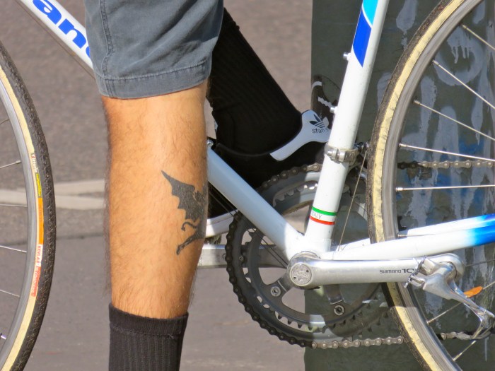 Alle Nase lang frage ich mich wieder, warum ich fotografiere und was eigentlich. Natürlich fallen die Antworten unterschiedlich aus. Aber einer Sache komme ich auf die Spur. Mir geht es um das Andere im Alltäglichen. Um Unvertrautes, das sich in das Gewohnte mischt und kurze Irritationen hervorruft, die ich – ohne Kamera – manchmal gar nicht dingfest machen könnte. Zum Beispiel dieses Männerbein. Das Tattoo ist der Kreuzbergerin längst kein unvertrauter Anblick, aber in diesem Moment, in dem nur der eine Flügel das Motivs zu sehen war, erinnerte mich das Bein an das des geflügelten Götterboten Hermes und ich fragte mich, ob der nicht doch noch unterwegs sei, und was er möglicherweise für unsereins im Gepäck haben könnte. Ich zum Beispiel würde liebend gerne ein Botschaft aus dem Olymp bekommen (nicht zu verwechseln mit Olympia), irgendetwas Mirakulöses vielleicht oder zumindest ein kleines Körbchen Nektar und Ambrosia. Mir mein Leben ungewohnt machen, um mit allen Sinnen gespannt zu bleiben? Ja, das wäre eine Antwort. Zumindest für heute.