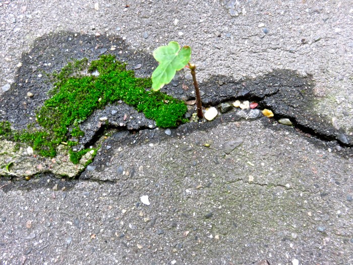 Noch lange bevor ich den ersten Bonsai-Baum sah, hatte ich mich in kleine Bäumchen verliebt, die irgendwo in den Betonritzen von Wegen oder schnell zugeschütteten Plätzen hervorgekeimt waren. Als Kind kannte ich alle Stellen auf dem Schulhof, und wenn ich nicht mit meinen Freundinnen spielte, lief ich von einer zur anderen und träumte mich auf diese Miniaturlandschaften. Mal war ich eine Reisende im Flugzeug, die sich die Welt spielzeugklein unter sich anschaute, mal schrumpfte ich mich gedanklich, um auf den kleinen Moosstücken zu wandern oder zu überlegen, wo ich ein Haus bauen würde und wie es aussehen könnte. Erst im hatte ich mich wieder an diese frühen Gedankenurlaube erinnert, als eine Birke, die es in einer solchen Ritze auf unserem Hof schon fast bis Kniehöhe geschafft hatte, ausgerissen wurde. Natürlich war ich empört und traurig, obwohl ich genau weiß, welchen Schaden so ein Bäumchen bald anrichtet. Also, die Birke ist weg, aber wie ich heute sah, hat sich was neues dort eingerichtet. Und ich träume einmal mehr von einer Insel.