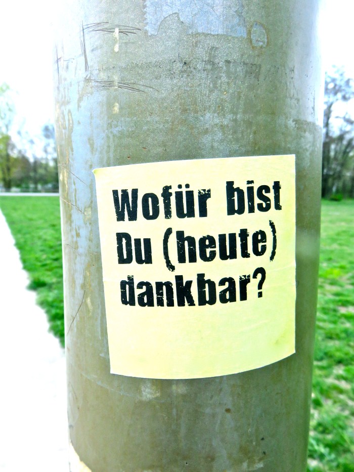 Gestern ist mir auf dem Weg zur Staatsbibliothek eine solche Frage begegnet (s.o.). Sie war relativ leicht zu beantworten, hat mich aber auf meinem gesamten Weg hin und zurück noch einmal mein Verständnis von Dankbarkeit überdenken lassen. Gar nicht so selbstverständlich, das alles.