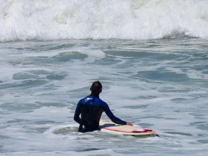 Es ist so. Aber es ist zum Glück auch ganz anders. Kalifornien bedient alle Klischees, die ich aus Europa mitgebracht habe. Dann aber auch wieder nicht. Denn natürlich wird gesurft, und wo die Surferbräute zum Picknick in kleinen hübschen Knubbeln am Strand lagern, und die Hundchen mit vom Wind aufgeplusterten Fell über die Strände sausen, die Sonne wie aus Kübeln über die Szene prasselt, stehe ich mitten in meiner Ansichtskartenglückseligkeit. Aber dann ist die Szene eben doch belebt. Der Wind braust um so viel lauter als ich mir das vorgestellt habe und das Meer grollt ununterbrochen. Toll. Gar nicht langweilig. Die Klischees sind da, aber sie öffnen sich zu einer ganz eigenen Szenerie. Und auf dem Parkplatz steht ein Auto, das ich weiterbewegen muss. Klingt einfach, ist es soweit auch. Nur bin ich, seit ich mit 18 den Führerschein gemacht habe, quasi nie Auto gefahren. Ein gewisser Nervenkitzel ist also schon dabei. Zumal es an der Küste hügelig ist und ich die Tachonadel im Auge behalten muss, um das Tempo einigermaßen konstant zu halten. Aber die Beach Boys und Ladies bleiben auch auf der Straße lässig, so dass ich mich nicht zu unsicher fühlen muss. Heute ist es übrigens bewölkt. Zum Glück, noch mehr Sonne hätte mein Berliner Blassgesicht nicht mehr vertragen…