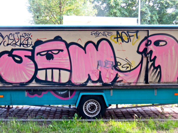 Wer an einem lauen Sommerabend über den Columbiadamm fährt, hat was zu sehen. In einem fort und auf beiden Fahrbahnseiten parken Lastwagen, Wohnwagen, Anhänger und die meisten von ihnen haben vom langen Stehen an der gleichen Stelle Farbe angenommen. Nicht, dass sie braun geworden sind. Sie sind eher bunt, denn hier tummeln sich offensichtlich Menschen mit Farbdosen, die Herumgeparktes für die besseren Wände halten. Zugegeben, hier und da muss es wohl schnell gehen. Und mehr als eine ungefähre Zeichnung oder etwas zackig Ausgemaltes gibt es dann nicht. Aber manchmal gibt es doch was zu lachen, so, wenn Buchstaben Zähne zeigen sich in Wurmform zusammenquetschen oder einen kleinen Gespensteraufstand proben.