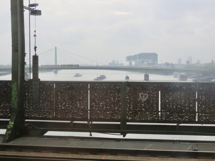 als ich gestern mit dem Zug in den Kölner Bahnhof einfuhr, dachte ich: Das heilige Köln: Viel hat sich seit dem Mittelalter geändert, andererseits, die Schiffe auf dem Rhein, die Bahnen auf den Brücken, eben Verkehr und Handel und trübes Wetter… – das hätten die Männer und Frauen von damals sicher wiedererkannt. Aber dieser Anblick: ein wahnsinniges Zukunfts-Szenario, wenn man es mal aus dem 12. oder 13. Jahrhundert aus betrachtet…