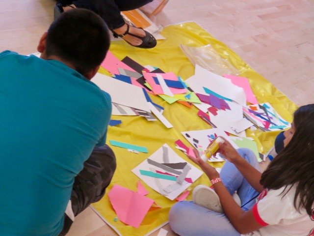 Warum ich das mochte? Erstens war es auch für mich anregend. Sie machten meist richtig coole Sachen und ich war als erwachsene Besucherin durchaus animiert, nun – vielleicht nicht mitzumachen, aber das, was sie taten in meine Betrachtung zu übernehmen. Wieso zum Beispiel saßen sie da mit diesen bunten Papierschnipsel? Auf welches ausgestellte Kunstwerk konnte sich das beziehen?