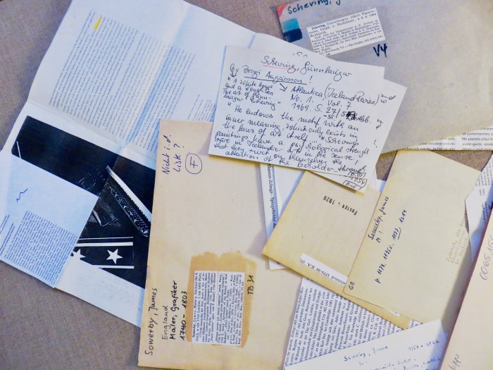 Ein zweiter Punkt ist: Wir arbeiten bis heute auch auf der Grundlage der Vorarbeiten unserer ehemaligen DDR-Kolleg/innen. Alleine aus der Zusammenstellung ihrer jeweiligen Sammlung von Artikeln, Ausstellungsankündigungen, bibliographischen Notizen oder biografischen Fragmenten zu den einzelnen Künstler/innen, wäre ein eigener Blog wert. Dieser unendliche Optimismus sämtlicher mit der Hand geschriebenen Karteikarten (selbstredend selbstgemacht) oder die liebevolle Pedanterie, auf DinA 5 Formate gefalteter Zeitungsartikel (die meist beim Auseinanderklappen zerfallen) und die zur Vergangenheit gerosteten Büroklammern) erzählen Geschichten und rühren mich oft bis ins Mark (nicht putzig, sondern mit Respekt – ich wäre an dieser Sisyphus-Arbeit wahrscheinlich zerbrochen). Oder die unergründlichen Regeln der Abkürzungen, die im AKL verwendet werden. Hier wird deutlich, was gelegentlich in der Forschung untergeht: wir stehen immer auf den Schultern unserer Vorgänger/innen, seien es Ries/innen gewesen oder auch nicht.