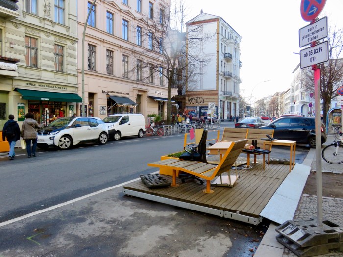 Man mag es kaum glauben. Aber Begegnung scheint dem Bezirk wichtig. Wir sprechen von Kreuzberg, damit kein Missverständnis aufkommt. Die Bergmannstraße ist eng. Jahrzehntelang lag sie im Schatten der Mauer. Selten, dass Autos vorbeikamen, Lieferfahrzeuge schon, Anwohner. Ansonsten führte es hier nicht mehr weit. Dass der Bergmannkiez nach dem Fall der Mauer zu einem Trendbezirk wurde, hat viel mit alter Bausubstanz und der günstigen Lage zu tun. Der Platz wird seitdem knapper, mehr Menschen tummeln sich, auf der kleinen Straße ist vor allem zu Stoßzeiten die Hölle los. Eine Idee sollte her (mehr Begegnung!). Seit 2009 gibt es eine kontrovers geführte Diskussion, und herausgekommen sind solche spielplatzartigen Konstrukte (im Fachsprech auch „Parklets“ genannt), die in eher kurzen Abständen zwischen den Parkplätzen aus dem Bürgersteig auf die Fahrbahn ragen. Herausgekommen – allerdings nur probehalber. Weil den Verantwortlichen vielleicht selbst klar wurde, dass das nicht funktioniert. Ca. 800.000 € sind bereits ausgegeben. Und jetzt? Ich frage mich, wie die Planung so an der Realität vorbei gehen konnte. Wo ist die an sich gute Idee, eine zu voll gewordene Einkaufsstraße zu beruhigen, schief abgebogen (vielleicht wirklich bei dem Anspruch, hier sollten Leute noch ausdrücklich zum begegnen animiert werden)?. Wahrscheinlich lässt sich das nur verfolgen, wenn man selbst an der Diskussion teilnimmt. Das werde ich ab Sommer auch machen, wenn Die Testphase vorzeitig beendet wird und die Karten (hoffentlich) noch einmal neu gemischt werden.