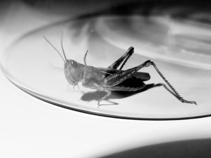 Ein Alien könnte nicht rätselhafter aussehen. Und – nein, im Glas war die Heuschrecke (ja?) nur, um den Weg aus der Wohnung zu machen. Was die jetzt wohl sieht, dachte ich, die kleine Wohnung muss für sie ja wie ein riesiges Feld aussehen. Und Zeit, sich meine Wohnung noch mal genauer anzusehen. Oder darüber nachzudenken, dass Füxe nur schwarz-weiß sehen (gehört zu den Dingen, die ich mir nie gut vorstellen kann – wahrscheinlich weil ich denke, „aber die Welt ist doch bunt“ – Da bekäme ich aber von vielen Tieren mitleidige Blicke!) Und schon sitzt ein Menschenkind wieder da und denkt: Was um alles in der Welt ist die Wirklichkeit!?