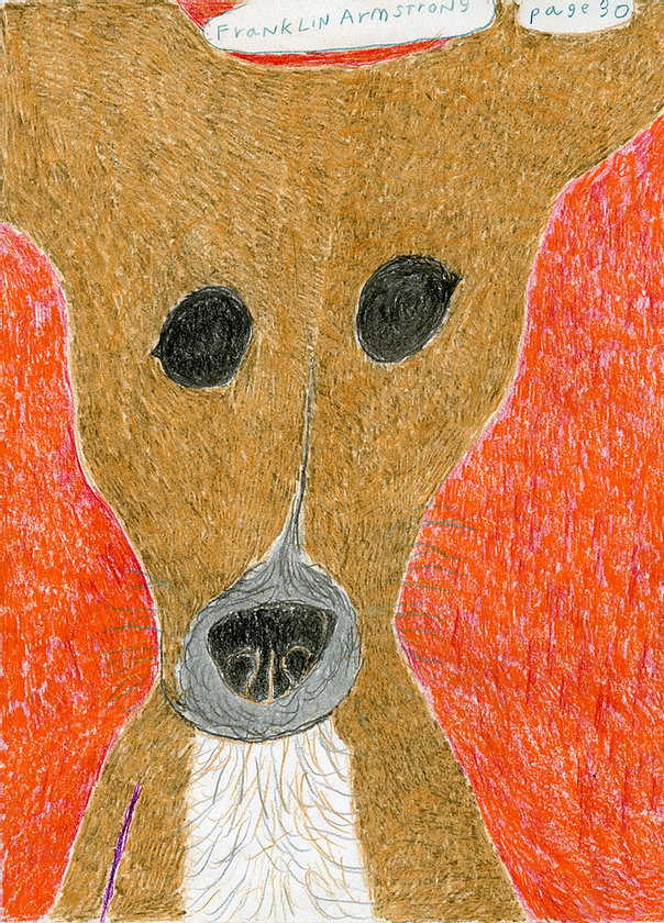 Der Hund auf dem Foto ist aus einer Malwerkstatt in Chicago. Dort sind Autodidakt/innen, die über die Werkstatt ihre Arbeiten weltweit vertreiben. Ich werde sie später noch vorstellen. Hier erst mal eine Kostprobe von Franklin Armstrong.