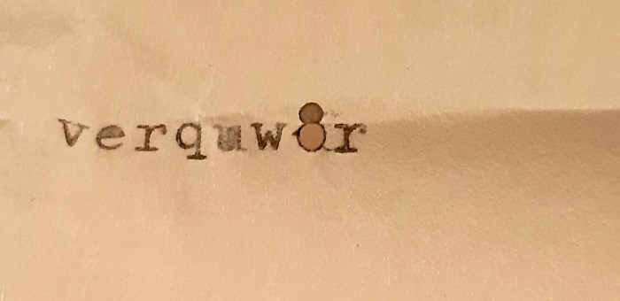 „verquwör“ habe ich vergeigt, denn eigentlich wollte ich verquer schreiben. Ja, Tippfehler gab es früher auch. Aber mein Text heißt „Ode an das öh“ und insofern ist ein „verquör“ gar nicht mal schlecht, zumal nur o’s und ö’s so schöne ausgestanzte Löcher im Papier hinterließen. Ein schöner Sonntagnachmittag also, zumal das Wetter schön war und der Spaziergang nachher durch den Tiergarten eine Freude. Für die, die zur Ausstellung wollen: sie läuft noch bis zum 5. Februar 2023.