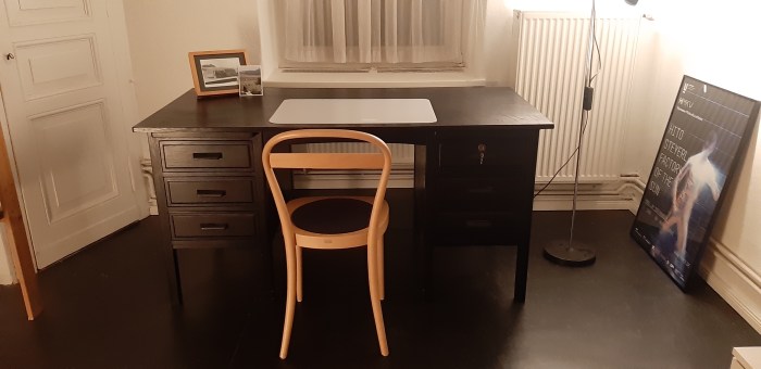 Richtig schön sieht er aus, im neuen Umfeld einer anderen Wohnung. Tatsächlich habe ich ihn lange nicht gesehen (er fristete ein paar Jahre auseinander gebaut auf dem Dachboden), und noch länger, denn in meiner eigenen kleinen Wohnung stand er am Ende fast nur noch im Weg und war ein schwarzes Ungeheuer aus der Vergangenheit. Davor hatte er seine eigene Holzfarbe und war Arbeitsplatz in der Firma, in der mein Vater arbeitete. Vielleicht war es sogar sein Schreibtisch. Das muss ich ihn nochmal fragen. Ich habe den Tisch dann schwarz lackiert, die Eichenholzfassung war mir viel zu spießig. Ich überlege, welches Wissen ich mir an dem Tisch angeeignet habe, ich kann mich nicht an Inhalte erinnern, mehr an das beklemmende Gefühl, das ganze an der Uni angebotene und abgefragte Wissen niemals bewältigen zu können. Wie anders erscheint es mir heute, wo schon Erstsemerster Essays schreiben (dürfen), in denen ihre Ansichten gefragt sind, nicht nur das Wiederkäuen von Fakten. Kurz dachte ich, meine Möglichkeiten an dem Schreibtisch nicht genutzt zu haben. Doch so stimmt es nicht. Am Ende war dieser Tisch die Rakete, die mich aus dem provinziellen Dasein nach Berlin schoss. Und das ist nun mal nicht der schlechteste Ort auf dieser Welt.