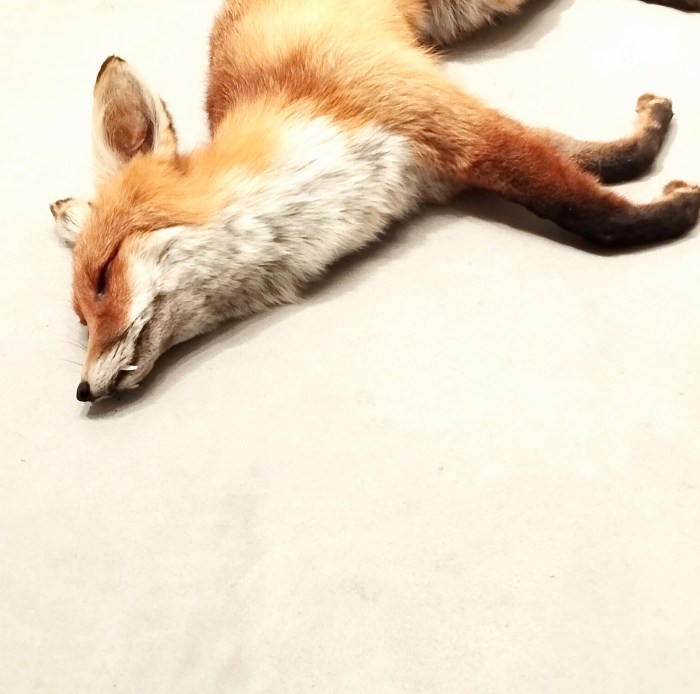 Er ist ausgestopft. Dennoch denke ich, er schläft. Und ich möchte ihm so gerne über das Fell streicheln. Weil ich früher mal Stofftiere hatte? Oder was läuft hier falsch? Der tote Fuchs als jemand, den ich nicht mehr erreichen kann (der Lebende hätte sich vermutlich auch nicht um mich geschert). Oder ein Fuchs wie ein Pferd, das ich tot geritten habe. Die Friedlichkeit im toten Körper. Vielleicht als Hoffnung. Seine Fangzähne. Die ihm, wenn er so daliegt, etwas schelmisches verleihen (Wehe aber, er will beißen). Einfach nur so so daliegen können. Ist es das? Ein Fell haben? Eine Sehnsucht nach Lebewesen, die keine Menschen sind?