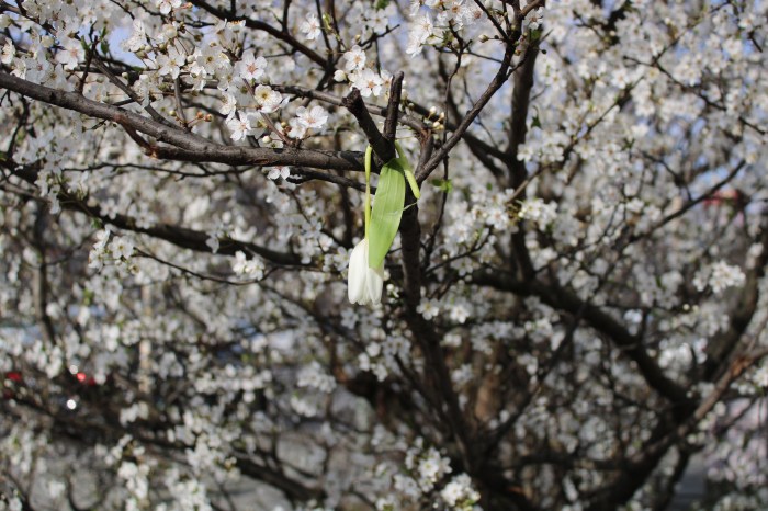 meine hängt gerade durch wie diese weiße Tulpe im Baum. Woher nehmen? Wie ein Mantra sage ich mir vor: Es ist nicht nur Alltag, es ist auch Dein Leben. Und nein. Kein Spass. Einfach nur etwas mehr Karacho. Welche Freiheit nehme ich mir? Welche unangenehme Sache kann ich angehen (ich kenne doch das tolle Gefühl, wenn das erledigt ist!)? Wem eine Freude machen? Wo meine Nase reinstecken? Erst mal was Naheliegendes machen. In der Hoffnung, dass daraus eine Startbahn für den Tag wird…