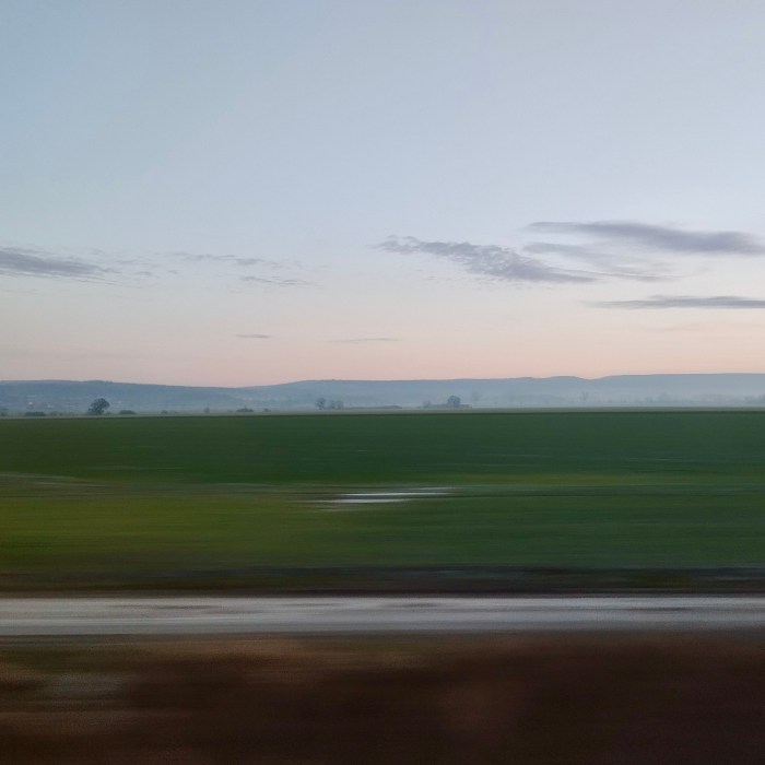 Ich saß gestern in der Bahn und schaute in einen erst grauen, und sich dann in viele Blautöne auffächernden Himmel. Aus Spass machte ich Handy-Fotos von der Landschaft, die an mir vorbei sauste. Erstaunlich viele Bilder kamen geradezu unversehrt aus der großen Geschwindigkeit bei mir an. Beiläufig, gleichzeitig banal und schön zugeleich. „Unsere Welt“, dachte ich, gleich danach auch „unser Deutschland“ (da musste ich lachen – aber, doch ja, stimmt schon).