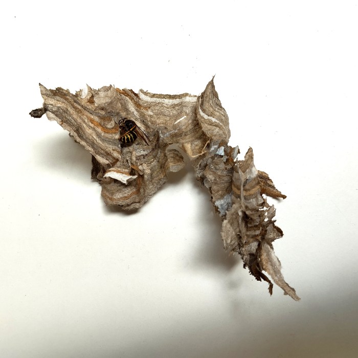 heute wollte ich eigentlich nur diese eine Schicht eines Wespennestes posten, das der Kammerjäger am Montag abgenommen hat. Samt toter Wespe. Menschen halt. Aber ich sehe schon ein, dass mein Nachbar sich nicht wohl fühlte mit der direkten Nachbarschaft am Küchenfenster. Denn Wespen sind ja nach der Brut nicht weg, wie meine Amseln, die jetzt diszipliniert brüten (natürlich nur die Amsel-Mama), ein echtes Vorbild, wenn ich gleich nebenan am Schreibtisch sitze und keine Lust habe.